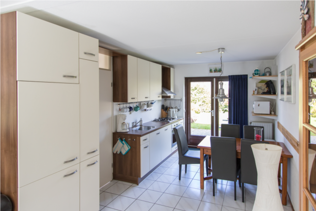De gezellig aangeklede woonkamer bestaat uit keukengedeelte, eetgedeelte en woongedeelte. In het woongedeelte van deze kamer staat een stoere bank en 3 gemakkelijke stoelen. De aanwezige platte tv is aangesloten op de kabel van het park. Voor een muziekje is er ook een radio/cd speler. En ook de internet fan wordt op zijn wenken bedient door de aanwezigheid van WIFI. In het eetgedeelte staat een eettafel met 6 stoelen. In de grote hoge koelkast kun je veel levensmiddelen en dranken koud bewaren. De moderne vernieuwde open keuken met een gaskookplaat met over eronder, koffiezetapparaat en senseo, toaster, magnetron, kookgerei en serviesgoed heeft voor je gemak ook een afwasmachine.
