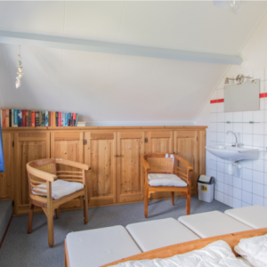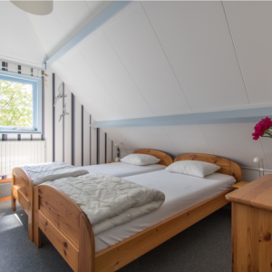 Op de bovenverdieping zijn er drie slaapkamers met vloerbedekking en een extra toilet met wasbakje aanwezig. De grootste slaapkamer beschikt over een tweepersoons bed, wasbak en een grote kledingkast onder de schuine kant. De twee andere slaapkamers hebben elk twee eenpersoonsbedden en ook opbergruimte. Alle bedden zijn voorzien van eenpersoons matrassen 0.90 x 2.00 mtr. en voorzien van Hollandse kussens ( 60 x 70 cm) en eenpersoons dekbedden.